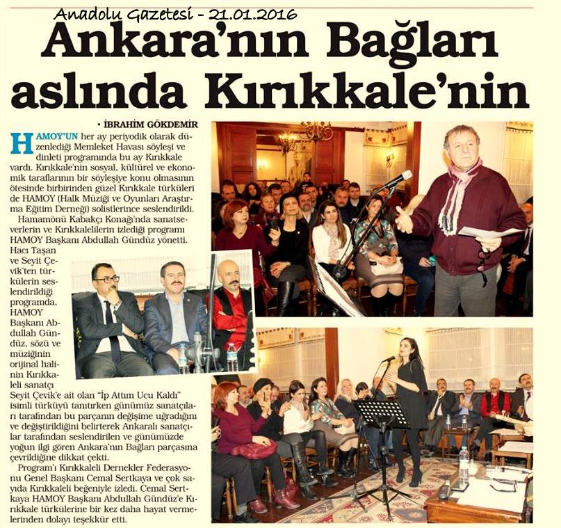 Hamamönü Kabakçı Konağı’nda 19 Ocak 2016 günü sanatseverlerin ve Kırıkkalelilerin izlediği programı HAMOY Başkanı Abdullah Gündüz yönetti.